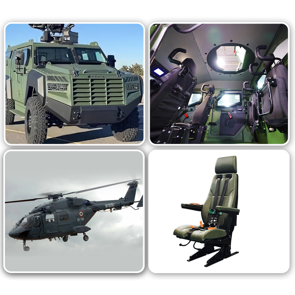 We specialize in the design, manufacturing, and supply of New Age Seating Solutions for Armoured Vehicles, High-Speed Boats, and Helicopters / VTOL, leading the charge with indigenous solutions aligned with the “Make in India” and “Atmanirbhar Bharat” initiatives. Our products meet global standards and have earned the trust of both domestic giants like Bharat Forge, L&T Defence, and TATA, as well as international customers across 17+ countries. With approvals from several global markets, ongoing collaborations with reputed customers, and new ventures into aerospace, we are at the forefront of innovation in defence, marine & air mobility seating.